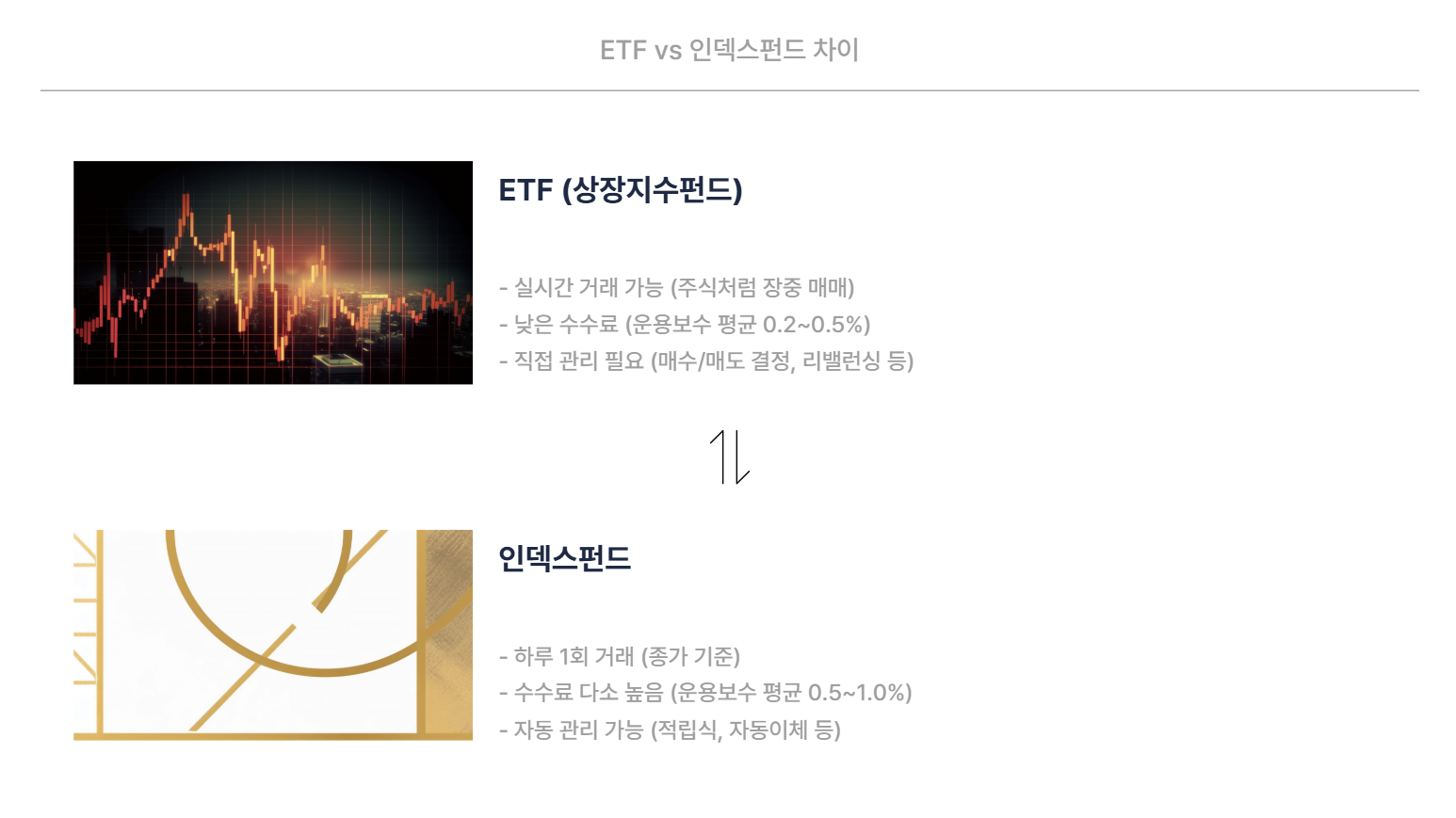 - 인덱스펀드 : 하루 1회 거래, 수수료 높음, 자동 관리 가능